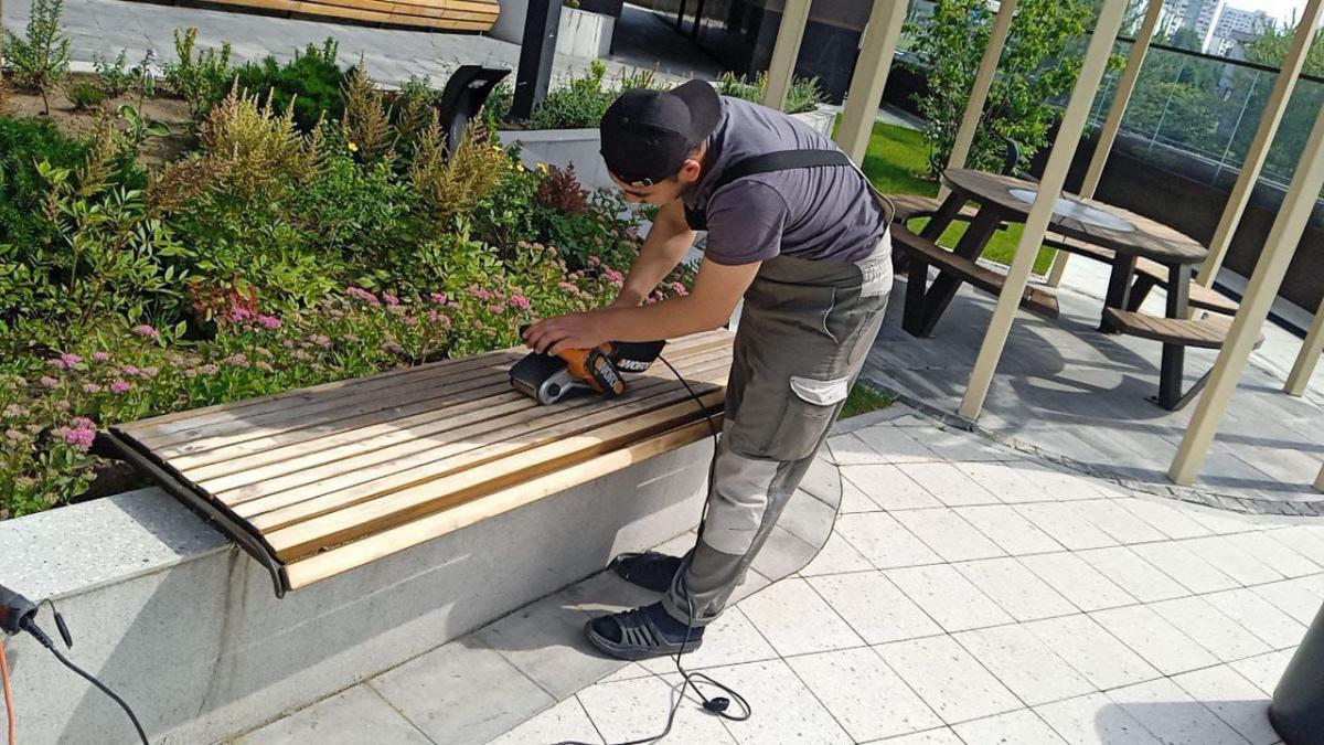В зоне стилобатной части начаты работы по лавочкам и шезлонгам.