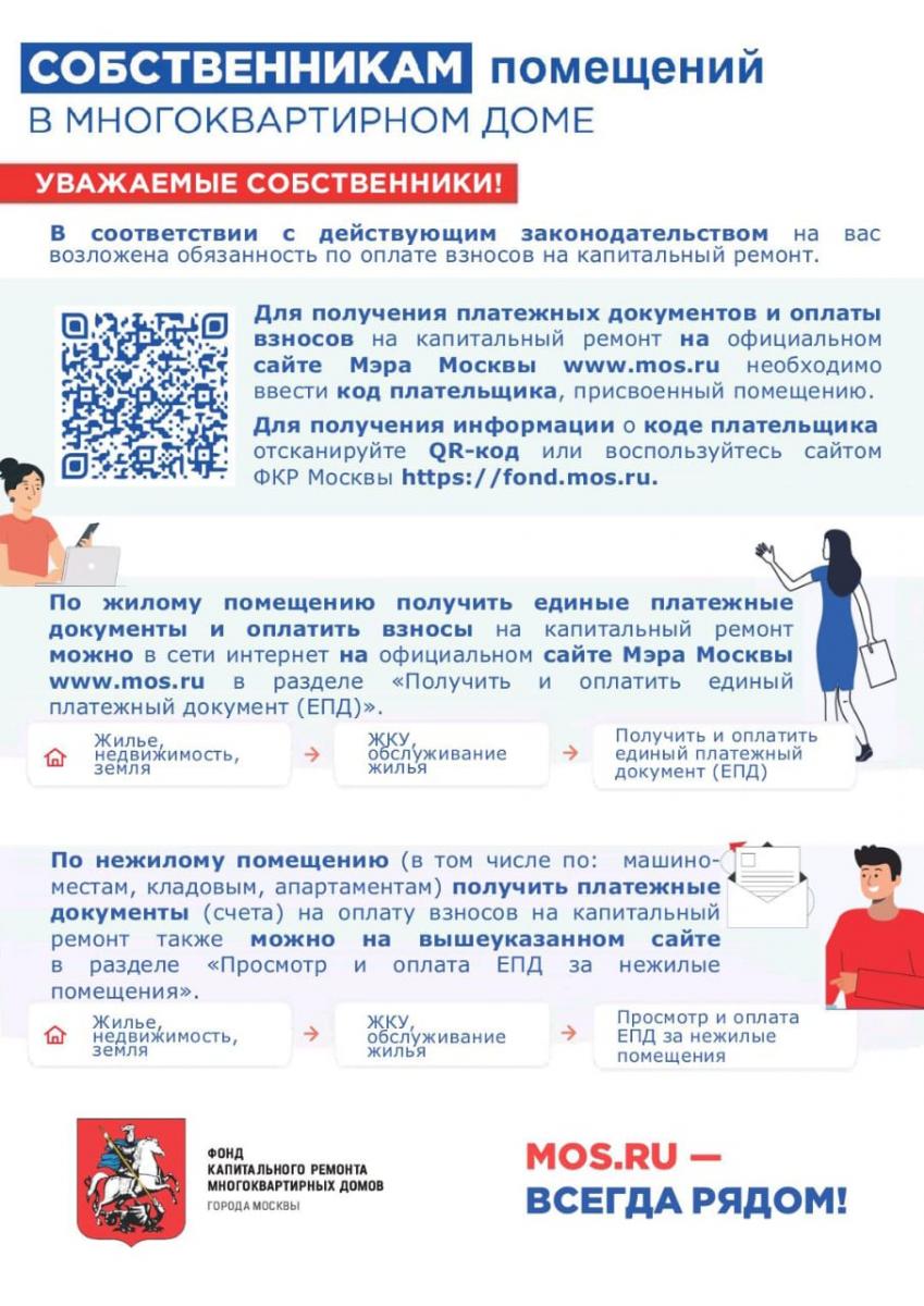 Для получения платежных документов и оплаты взносов на капитальный ремонт на официальном сайте Мэра Москвы www.mos.ru необходимо ввести код плательщика, присвоенный помещению. Для получения информации о коде плательщика отсканируйте QR-код или воспользуйтесь сайтом ФКР Москвы https://fond.mos.ru .