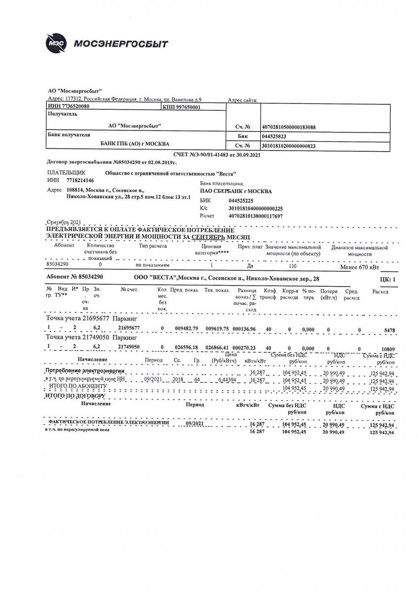 Счет о потребленной в паркинге электроэнергии
