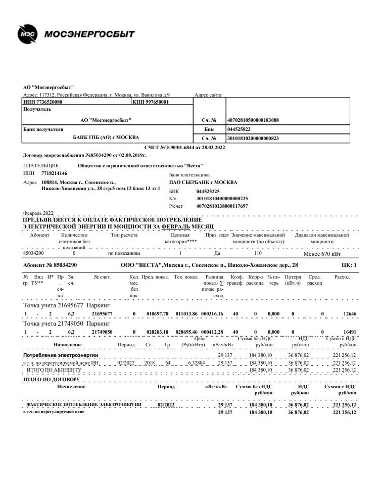 Счет о потребленной в паркинге электроэнергии