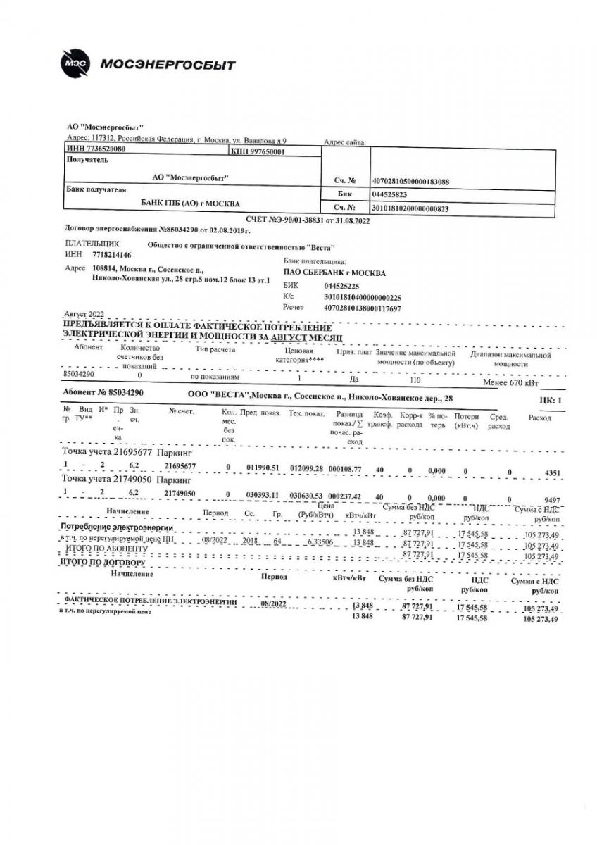 Счет о потребленной в паркинге электроэнергии