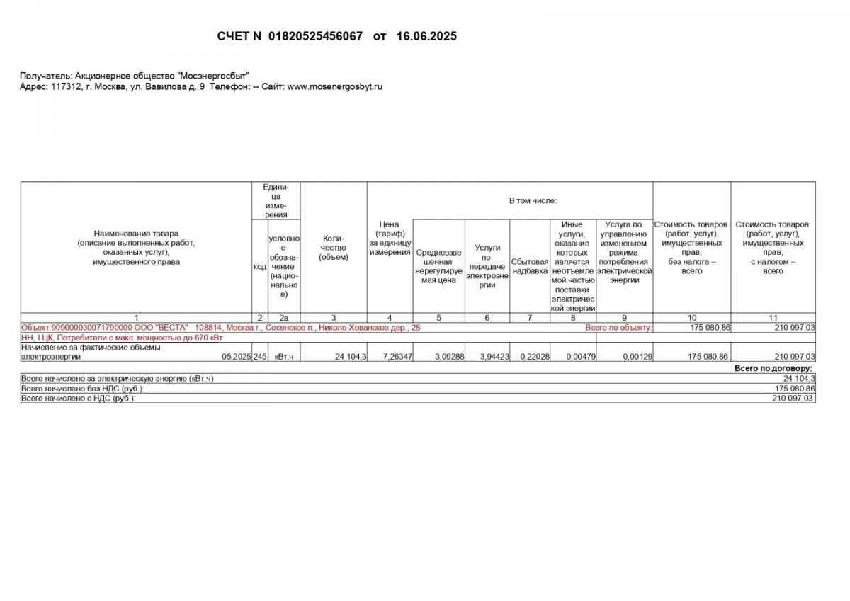 Счет за потребленную электроэнергию