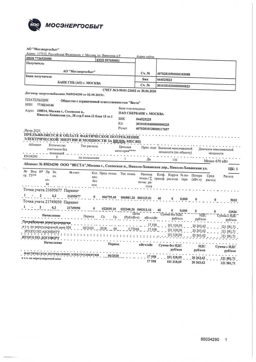 Счет о потребленной в паркинге электроэнергии