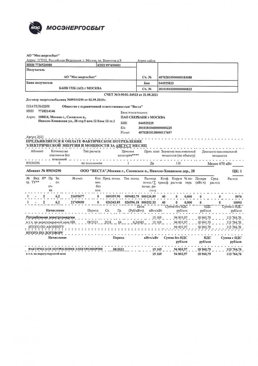 Счет о потребленной в паркинге электроэнергии